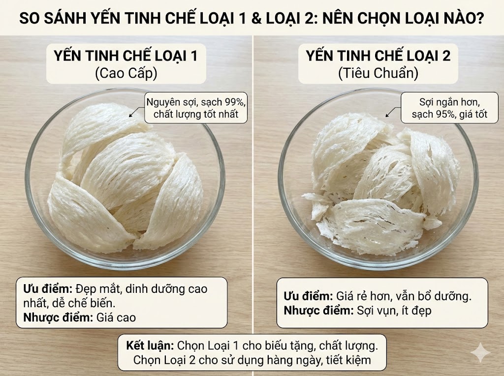 Về giá thành: Đây là yếu tố quan trọng ảnh hưởng đến quyết định mua hàng. Thông thường, giá yến tinh chế loại 1 sẽ cao hơn loại 2 từ 10% đến 20% do chi phí nguyên liệu đầu vào (tổ yến thô ít vụn) và công sức tuyển chọn sợi dài của thợ thủ công.