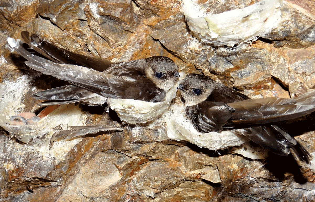 Quá trình dệt tổ: Chim yến sẽ dùng lưỡi đẩy nước dãi chim yến ra ngoài và quẹt lên vách đá/tường nhà yến theo hình xoắn ốc.