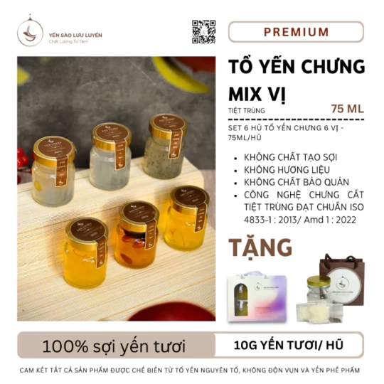 Yến sào là một loại thực phẩm giàu giá trị dinh dưỡng, chứa nhiều Axit amin thiết yếu, nguyên tố đa - vi lượng hỗ trợ hệ miễn dịch và sức đề kháng cho cơ thể. Thành phần: Sợi yến tươi nguyên chất 100% (gồm 10g yến tươi = 2g yến sấy khô), hạt chia, đường phèn.