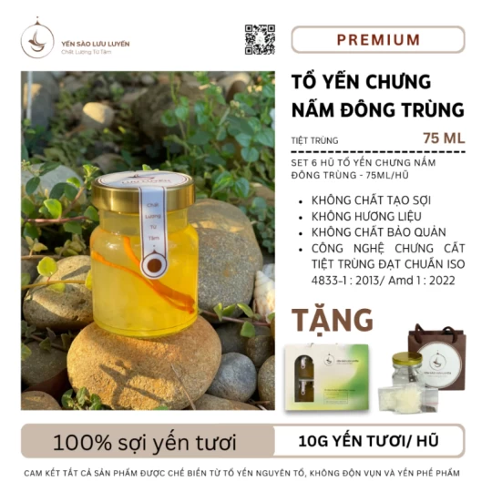 Yến sào là một loại thực phẩm giàu giá trị dinh dưỡng, chứa nhiều Axit amin thiết yếu, nguyên tố đa - vi lượng hỗ trợ hệ miễn dịch và sức đề kháng cho cơ thể. Thành phần: Sợi yến tươi nguyên chất 100% (gồm 10g yến tươi = 2g yến sấy khô), nấm đông trùng, đường phèn.